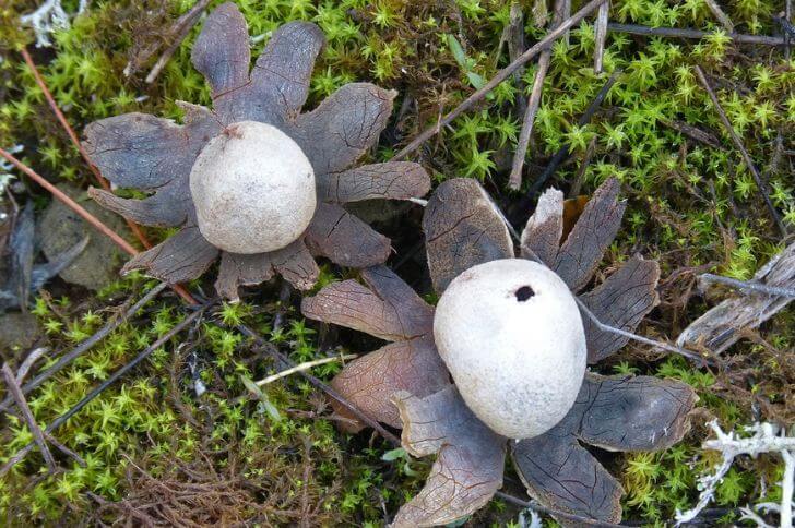 False earthstars are small about 0.5-3 inches in diameter. Young fruiting bodies look like small puffball mushrooms. As they mature, the outer layer opens and splits up, forming pointed rays. The inner layer is white and solid. False earthstars are inedible.